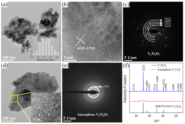 中国低活化马氏体钢(CLAM)因其良好的机械性能和相对成熟的制备技术,被选为聚变堆包层的主要候选结构材料之一。马氏体钢的上限使用温度通常为550℃,本研究采用氧化物弥散强化(ODS)方法以进一步提升其上限使用温度。氧化物Y2Ti2O7是ODS钢中常用的强化相,通常是将钛(Ti)和三氧化二钇(Y2O3)与钢基体粉末进行机械合金化,并在随后的热固结或热处理过程中形成。然而,对于单独添加Y2Ti2O7在ODS钢制备过程中的结构演变和其对材料结构及性能影响机理尚不清楚。